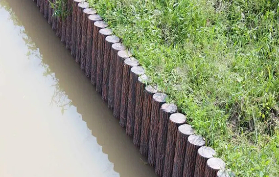 在環境整治工程中,對傳統擋土墻和全坡護岸結構進行了改進,提出了仿木樁的復合生態護岸結構。因為仿木樁的復合式生態護坡結構可以事先預制鋼筋混凝土圓樁,現場壓樁施工,機械化程度高、速度快,密排的護岸結構外觀美,親水性和擋土性均較好,使環境生態化、人性化,達到實用且美的目的。